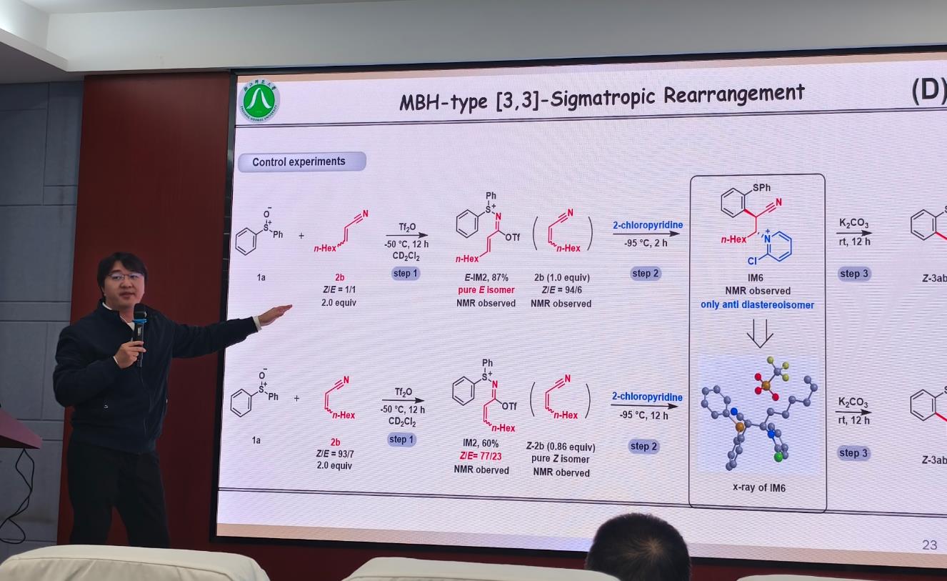 报告中,彭勃教授详细介绍了其团队在芳基亚砜Claisen型重排反应研究领域的新发现,该成果开辟了基于高价碘/硫的重排化学研究方向。借助高价碘/硫所赋予的独特驱动力,通过多步组装和低温重排策略,一系列独特的重排方法和途径得以揭示。相关研究突破了传统重排反应的范畴,为重排反应新模式的探索及其应用场景拓展奠定了重要基础。报告结束后,彭勃教授与在场师生围绕反应机理、应用前景等核心内容,展开了深入交流与探讨。