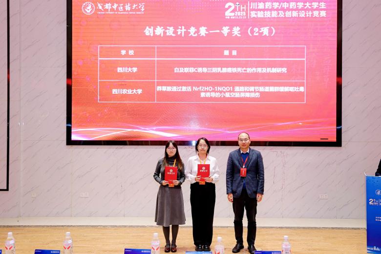 在创新设计竞赛中,我院2023级药学专业辛恬、刘义平,2024 级药学专业刘彤欣,2021级临床药学专业卢雅杰四位同学组队完成的参赛作品——“白及联菲C诱导三阴乳腺癌铁死亡的作用及机制研究”荣获创新设计竞赛一等奖(本届竞赛的最高级别奖项)。该团队的指导老师为药理学系彭芙副研究员。2023级药学专业高璇、赵童童两位同学组队完成的参赛作品——“结合可视化评价的阿司匹林肠溶片崩解溶出特性研究”荣获创新设计竞赛优胜奖。该团队的指导老师为药剂学系邓黎副教授。