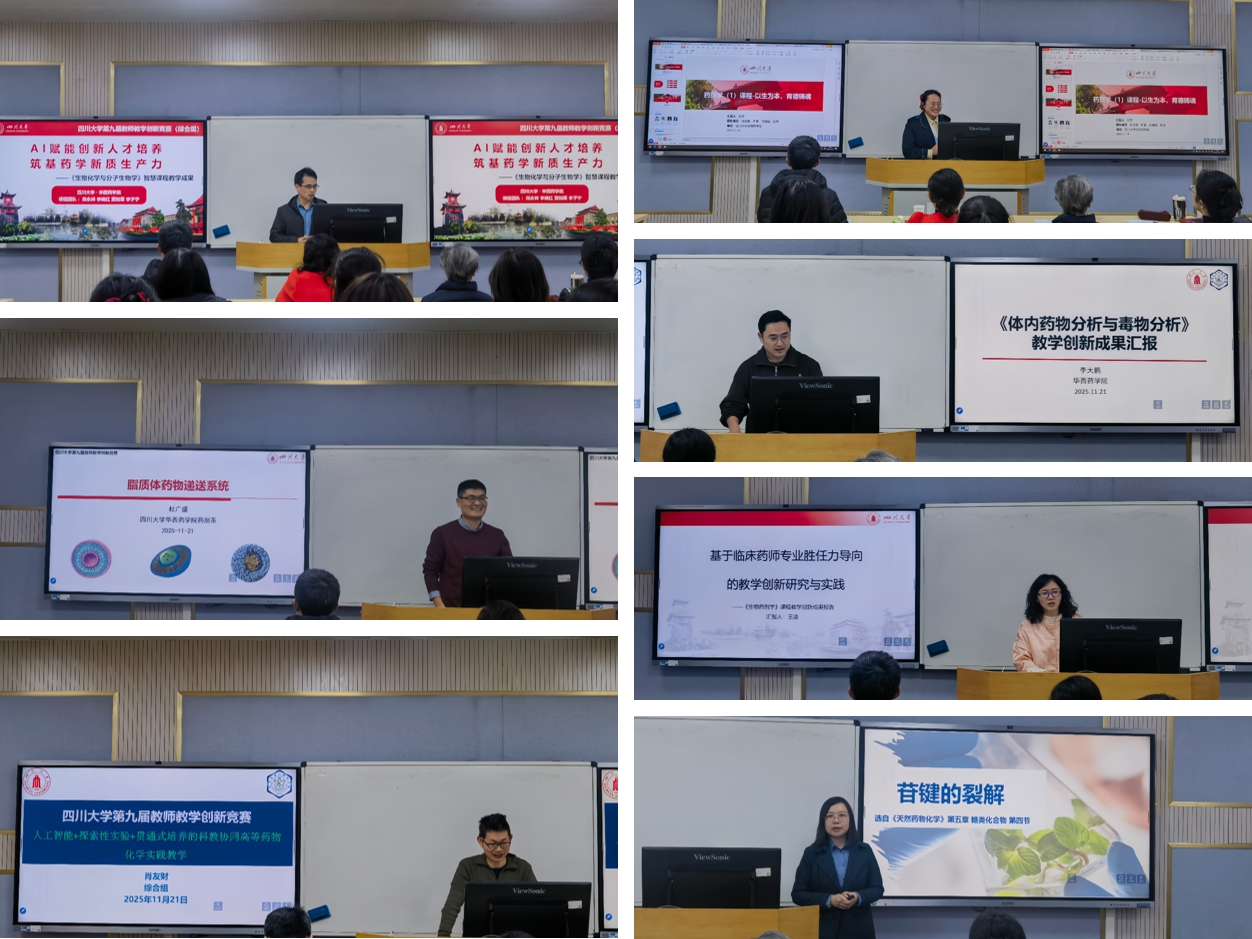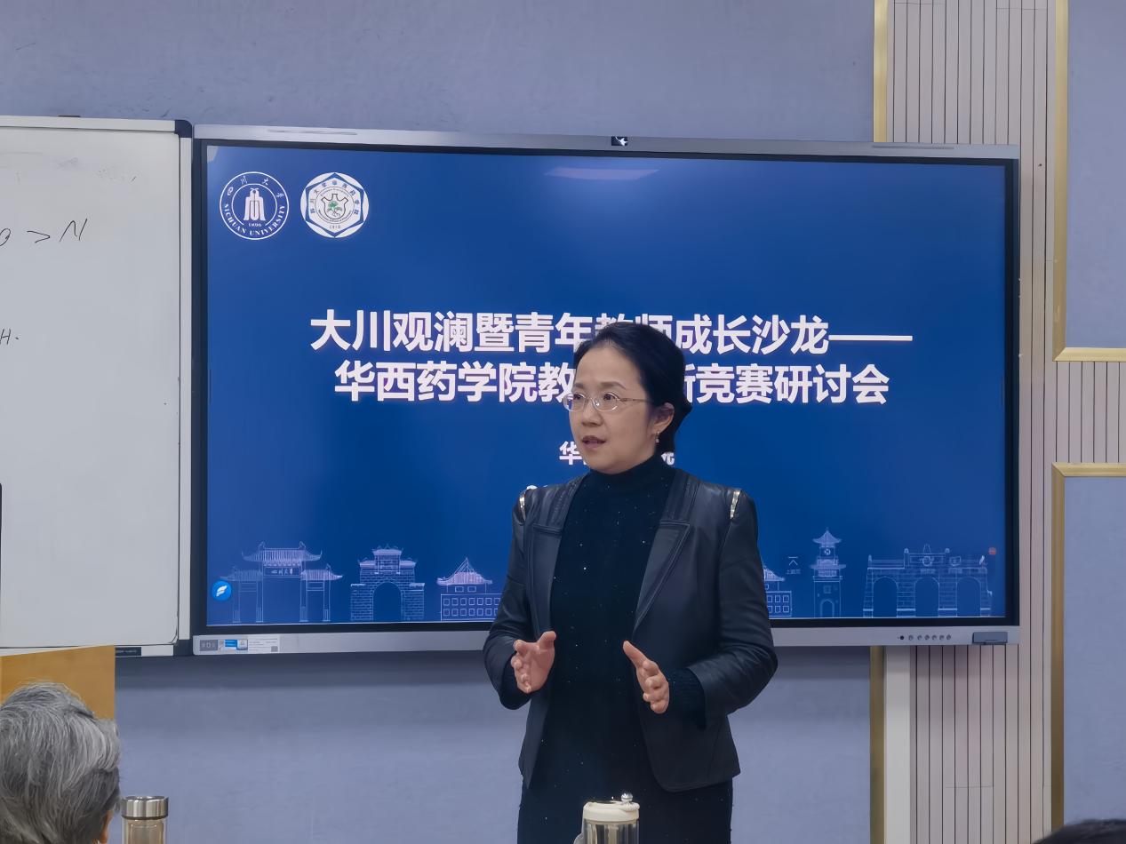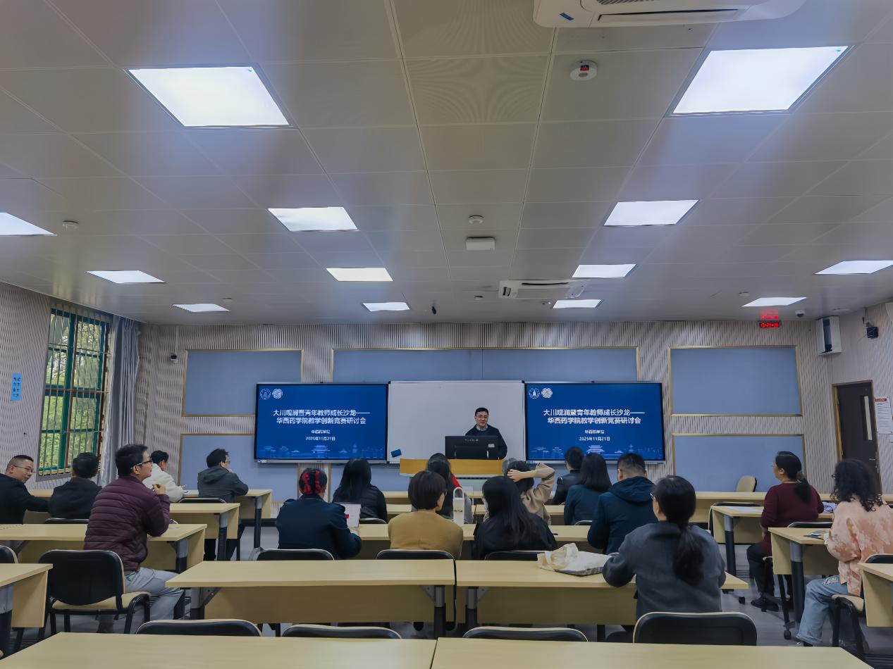 为落实立德树人根本任务,加强课程建设,服务教育数字化战略行动,引导教师积极探索教学模式创新,打造兼具高阶性、创新性与挑战度的优质课程,同时为学校第九届教师教学创新竞赛做好充分准备,2025年11月21日下午,由学院教学管理科、学科建设办公室与工会联合举办的大川观澜暨“荣药风华”青年教师成长沙龙——华西药学院教学创新竞赛专题研讨会顺利举行。学院党委书记范瑾、教学督导组专家、资深教师及多位青年教师参加,活动由学院工会主席唐培主持。