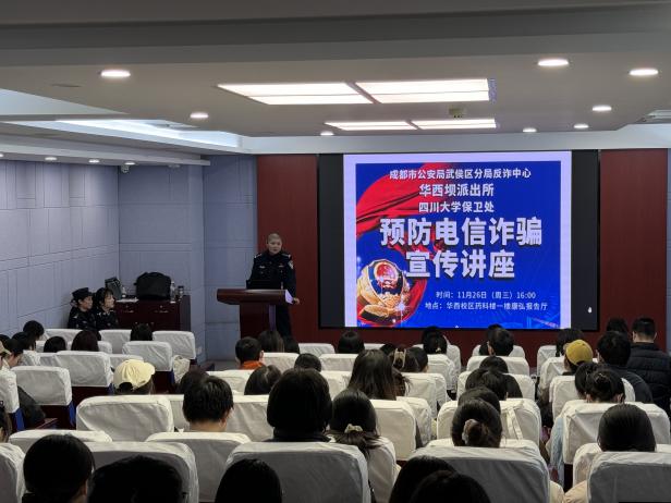 11月26日,学院联合学校保卫处邀请武侯公安分局反诈中心、华西坝派出所在华西校区药科楼康弘报告厅开展预防电信诈骗宣传讲座。