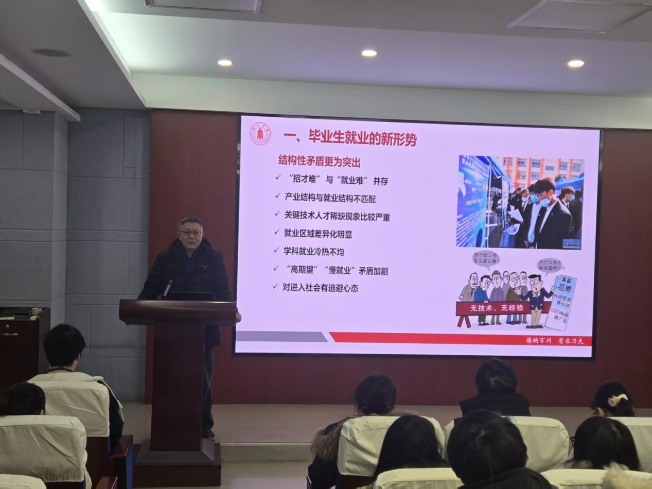 会上,章程首先围绕当前就业形势展开分析,结合药学相关行业发展趋势,为同学们提供了有针对性的就业指导与建议。他指出,同学们应树立正确的就业观,主动把握招聘机会,积极提升综合素质与求职竞争力。此外,还提醒毕业生在求职、实习及离校过程中注意人身、财产、交通及信息安全,增强防范意识。