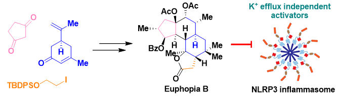 我院秦勇教授、陈其凤副教授及合作者,开发了一条高效且可规模化的全合成策略。该路线以铜催化的不对称氢硼化、Claisen重排以及SmI介导的环化为关键反应,成功攻克了连续手性中心构建等挑战,实现了Euphopia B的单批次百毫克级制备,为深入开展其生物学研究奠定了坚实的物质基础。与北京生命科学研究所张泽博士合作,经系统生物活性筛选,研究发现Euphopia B能特异性抑制由非钾离子外流(potassium efflux-independent)诱导的NLRP3炎症小体激活。这一发现不仅为阐明NLRP3复杂的激活机制提供了关键的化学探针,也为相关炎症性疾病的药物研发提供了新的先导骨架。