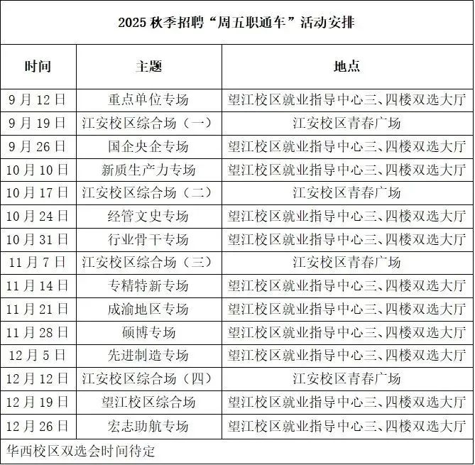 就业指导中心将于每周五下午举办“周五职通车”专场双选会,分行业、分层次、分类型,满足不同用人单位的招聘需求,契合不同专业毕业生的求职需要。具体时间地点初步安排如下: