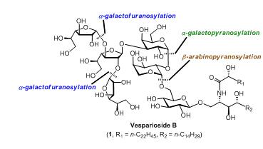 海洋鞘糖脂通常具有免疫调节作用。Vesparioside B是一种结构复杂的六糖鞘糖脂,由意大利Mangoni小组从加勒比海绵Spheciospongia vesparia分离出来,该天然产物由一系列脂链结构不同的同系物组成。其糖链部分的结构是迄今海洋鞘糖脂糖链中最为复杂的,具有如下特征:(1) 六个糖残基中有三个半乳呋喃糖单元,这种富含呋喃糖的现象在天然鞘糖脂中极为罕见;(2) 含有多种类型的合成极具挑战的1,2-顺式糖苷键;(3) 非还原端的2,3-分支糖结构以及空间拥挤的两个连续的1,2-顺式糖苷结构无疑更增加了合成难度。杨劲松课题组事先对该分子的组装策略进行了大量摸索,最终确定采取[4+3]汇聚式偶联策略,将分子拆解为左侧四糖供体片段和右侧二糖脂受体片段。而对于这两个片段中所含的1,2-顺式糖苷键,分别采用5-或6-O-(2-喹啉羰基,Quin)取代的D-半乳呋喃糖硫苷供体和3,4-二-O-苯甲酰基保护的D-阿拉伯吡喃糖基硫苷供体顺利实现了α-半乳呋喃糖苷键和β-阿拉伯吡喃糖苷键的立体选择性合成。分头制得左右两个高级中间体以后,再通过4,6-O-苄叉基导向的α-半乳吡喃糖苷化反应立体专一性地将两者连接起来,完成了整个六糖糖脂骨架的构建,最终脱除保护基实现了vesparioside B的全合成。并通过对比合成物及其全乙酰化物与对应的天然源化合物的波谱数据,确证了vesparioside B的结构。