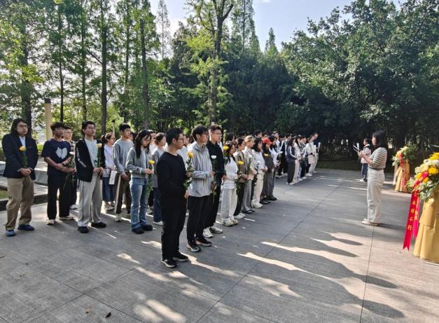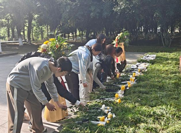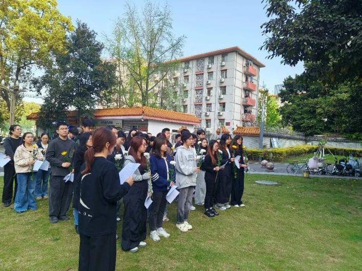 同日,2024 级、2025 级本科生在江安校区英烈碑广场开展 “不忘历史,牢记使命” 主题祭奠。同学们肃立默哀、敬献鲜花,并以诗歌朗诵抒发爱国情怀,立下传承英烈精神的青春誓言。